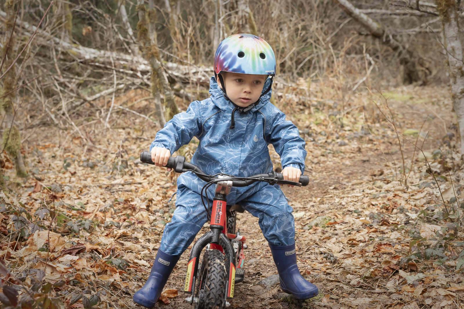 My son loves it. The thumb holes mean it doesn't ruck up when on his bike and the longer length at the back keeps him dry when he rides through muddy puddles.